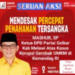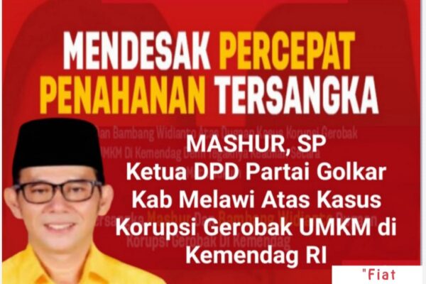 Jakarta, Jayanesia – Januari 2025 | Kaukus Muda Anti Korupsi (KAMAKSI) mendesak Bahlil Lahadalia selaku Ketua Umum Partai Golkar untuk segera memberhentikan Mashur, Ketua DPD Golkar Kabupaten Melawi, yang telah ditetapkan sebagai tersangka dalam kasus korupsi pengadaan gerobak UMKM di Kementerian Perdagangan (Kemendag). KAMAKSI juga menuntut langkah tegas dari Bareskrim Polri agar segera menahan Mashur…