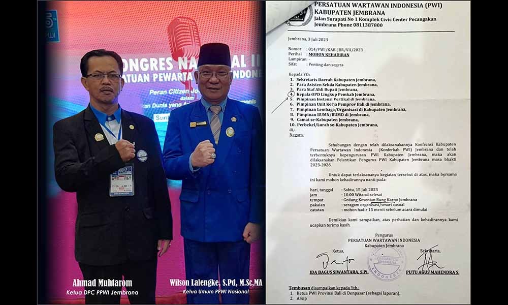 Jembrana – Terkait beredarnya surat undangan pelantikan Pengurus Persatuan Wartawan Indonesia (PWI) Jembrana dengan kop surat beralamat di Kompleks Pemkab ke sejumlah pejabat dan lembaga di lingkungan Kabupaten Jembrana, hal tersebut dikomentari dan dikecam berbagai pihak. Salah satu Tokoh Pers Nasional Wilson Lalengke, S.Pd., M.Sc., M.A., yang getol membela masyarakat terzolimi bersuara keras tentang surat undangan tersebut.
